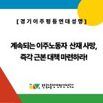 [정책의견서] 이재명 정부의 산업재해 예방대책 수립에 필요한 핵심 과제(25.08.14) 2025-08-15 [성명] 이재명 정부 하에서도 끊이지 않는 미등록 이주민에 대한 인간사냥, 강제단속 즉각 중단하고 미등록 이주민체류를 보장하라! 2025-09-25 [한국노동안전보건연구소 젠더와노동건강권센터 월례토론회 – 존재가 저항이다, 팔레스타인 민중의 싸움 2025-09-19 [기자회견문] ‘아프면 쉴 권리 공동행동’ 출범 기자회견 (2025.09.09) 2025-09-09 [9월 노동시간센터 월례토론회] 2025-09-04 노동운동가 고 이훈구 동지 5주기 추모 및 보듬는 학교 영상 2025-08-29 [기자회견] 한전kps 불법파견 그만! 직접고용하라! 불법파견 판결을 촉구하는 노동안전보건단체 기자회견 2025-08-27 고 이훈구 동지 5주기 추모제 (2025년 8월 31일 오전 11시, 마석 모란공원) 2025-08-19 [당장멈춰 팀] 중대시민재해 예방을 위한 현장중심의 안전보건관리체계 구축 방안 : 경기도 사례를 중심으로 2025-08-18 [8월 노동시간센터 월례토론회] 특고·플랫폼 노동자의 휴식권 2025-08-12 여전히 유효한 광장의 요구, 공적 돌봄의 확대 – 서울시사회서비스원 폐원 1년, 지금 당장 재운영하고 사회서비스원 확대하라! 2025-08-06 [성명] 계속되는 이주노동자 산재 사망, 즉각 근본 대책을 마련하라! 2025-08-05 [기자회견] 공공돌봄 기관 서울시 사회서비스원 폐원 1년, 서울시사회서비스원 복원하고 전국 사회서비스원 설치 완결하라! 2025-08-05 [기자회견] 노동안전·인권단체 기자회견 “일하는 모든 사람들에게 노동권을! 더 나아간 노조법 2·3조 개정을 촉구한다!” 2025-07-29 [성명서] 이재명 정부는 이전 정부의 반인권적·폭력적 강제단속추방 즉각 중단하라! 2025-07-17 [성명] 예견된 법무부의 “외국인 가사사용인 시범사업” 실패, 지금 당장 폐기하라! 2025-07-17