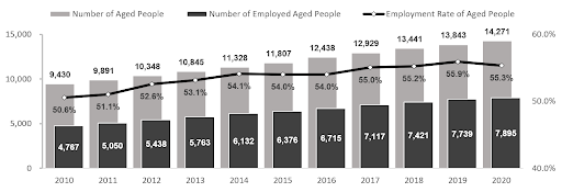 Figure 1. Trends of the size of population and employment of Aged people, 2010~2020. (Source; Economically Active Population Survey in 2020)