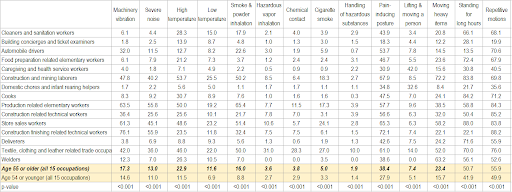 Table 2. Proportions of workers who are exposed to usual occupational hazards in fifteen occupations which employ many aged workers. (%)